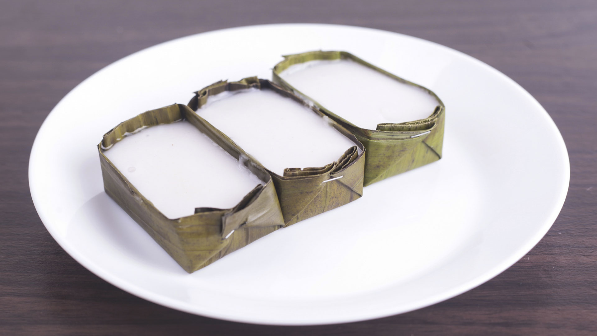 1. Prepare the mould using pandan leaves or opt for containers. Put in a layer of sugar on the base.